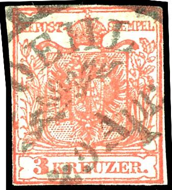 (G) FOEHL 29 April, curve cancel S.O.T.N on 3 Kreuzer red, handmade paper type III, still full margins (on all sides very close margin), Mueller number 785 d, 420 points (3Xa)