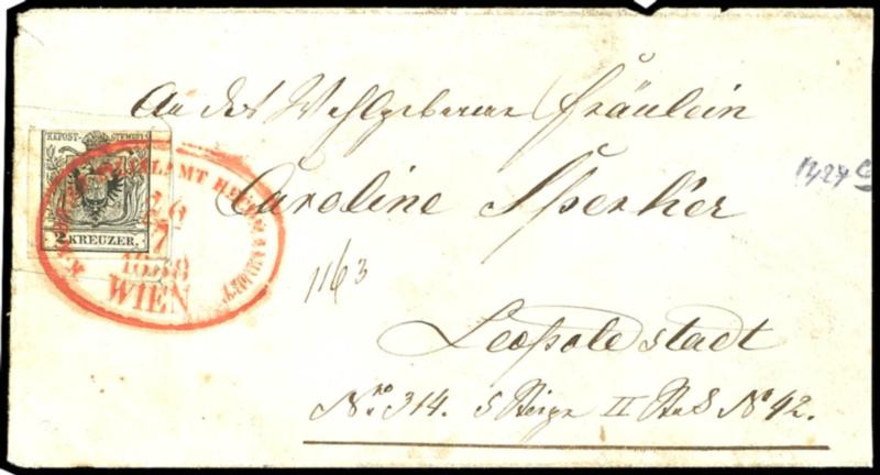 1854, 2 Kreuzer black, machine paper, type IIIb, plate A, having full margins extremely fine copy on local letter the 1 weight rate with cancellation "9-11 Fr. / Vienna / 11-VII" (1858", photo expertize Rene Strakosch "genuine and immaculate (2Ya) Certificate 1854, 2 Kreuzer schwarz, Maschinenpapier, Type IIIb, Platte A, vollrandiges Kabinettstück auf Ortsbrief der 1 Gewichtsstufe mit Entwertung "9-11 Fr. / WIEN / 11-VII" (1858", Fotobefund Rene Strakosch "echt und einwandfrei (Image)