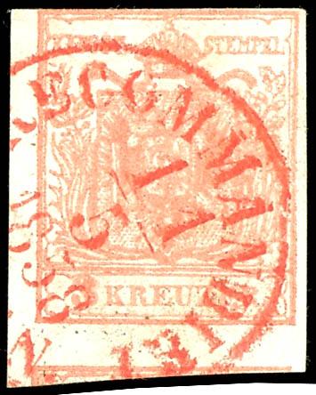 3 Kr. pale red, handmade paper type IIIa, left lower corner of the sheet, 7 : 4 mm, centered clear single circle postmark "PERESZLENY 17 / 1" (Mueller number 2104, 40 points), Michel 350.- (3Xa) 3 Kr. blassrot, Handpapier Type IIIa, linke untere Bogenecke, 7 : 4 mm, zentrischer klarer K1 "PERESZLENY 17/1" (Müller Nr. 2104, 40 Punkte), Mi. 350.- (Image)