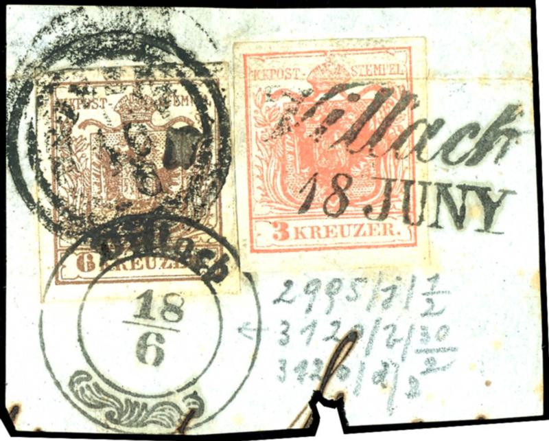 6 Kreuzer brown, handmade paper type Ia, double cancellation two ring cancel "TRIEST 16 / 6" and "Villach 18 / 6" on piece with postage stamps added to cover to pay postage due 3 Kreuzer rose red, handmade paper type Ia, with clear two-line cancel cursive handwriting stamp "Villach 18 JUNY", interesting combination, photo expertize Steiner VOEB (2020) "both stamps with wide margins and fresh colours, horizontal break through letter piece and stamps" (4,3Xa) Certificate 6 Kreuzer braun, Handpapier Type Ia, Doppelentwertung K2 "TRIEST 16/6" und "Villach 18/6" auf Briefstück mit Nachfrankatur 3 Kreuzer rosarot, Handpapier Type Ia, mit klarem L2 Schreibstiftstempel "Villach 18 JUNY", interessante Kombination, Fotobefund Steiner VÖB (2020) "beide Marken breitrandig und farbfrisch, waagerechter Bruch durch Briefstück und Marken" (Image)