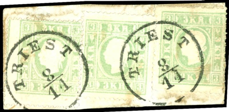 3 Kreuzer Franz Joseph, green, 3 pieces on piece (left stamp from other sheet), 2 clear single circle postmark "TRIEST 8 / 11" (inverted 8), not so fresh and stained, otherwise pristine, photo expertize Dr. Ferchenbauer VOEB "very fine example", Fb. 610.- (12a(3)) Certificate 3 Kreuzer Franz Joseph, grün, 3 Stück auf Briefstück (linke Marke von anderem Bogen), 2 klare K1 "TRIEST 8/11" (kopfstehende 8), etwas unfrisch und fleckig, sonst tadellos, Fotobefund Dr. Ferchenbauer VÖB "sehr schönes Stück", Fb. 610.- (Image)