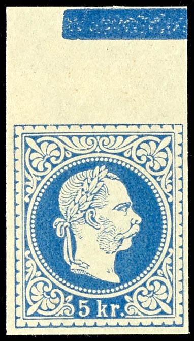 1867, 5 Kreuzer "Emperor Franz Joseph", imperforated proof print on thin paper in light blue, without gum - as produced, very fine, from the archive collection the Austrian postal administration, unsigned, photo expertize Roger Soecknick BPP "genuine and immaculate. " (37IIPU) Certificate 1867, 5 Kreuzer "Kaiser Franz Joseph", ungezähnter Probedruck auf dünnem Papier in hellblau, ohne Gummierung - wie hergestellt, tadellose Erhaltung, aus der Archivsammlung der Österreichischen Postverwaltung, unsigniert, Fotoattest Rüdiger Soecknick BPP "echt und einwandfrei." (Image)
