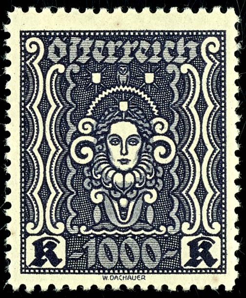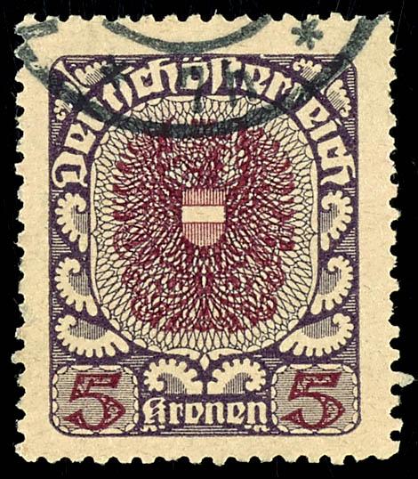 1920 / 21, 5 coronas dark lilac / red violet on gray paper, used, very fine, attest Fritz Puschmann VOEB "flawless, Michel 800.- (318yb) Certificate 1920/21, 5 Kronen dunkellila/rotviolett auf grauem Papier, gestempelt, tadellose Erhaltung, Befund Fritz Puschmann VÖB "fehlerlos, Mi. 800.- (Image)