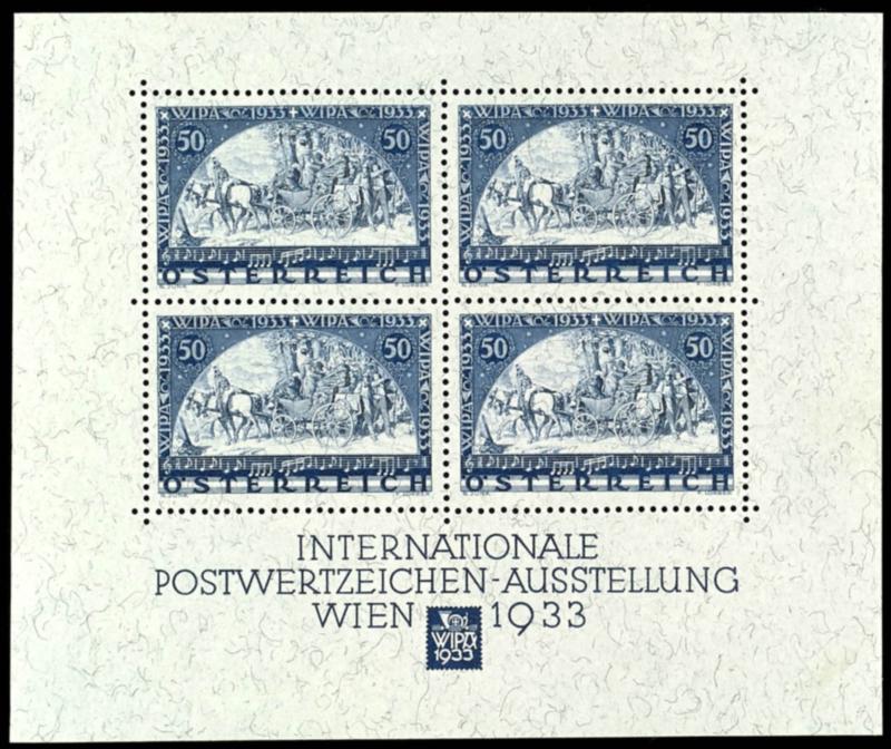 1933, souvenir sheet issue "Vienna Philatelic Exhibition", mint never hinged, as usual with hardly visible adhesive points in the margin, original size. unsigned. (Bl.1) 1933, Blockausgabe "WIPA", postfrisch, wie üblich mit fast nicht sichtbaren Klebepunkten im Rand, Originalgröße. Unsigniert. (Image)