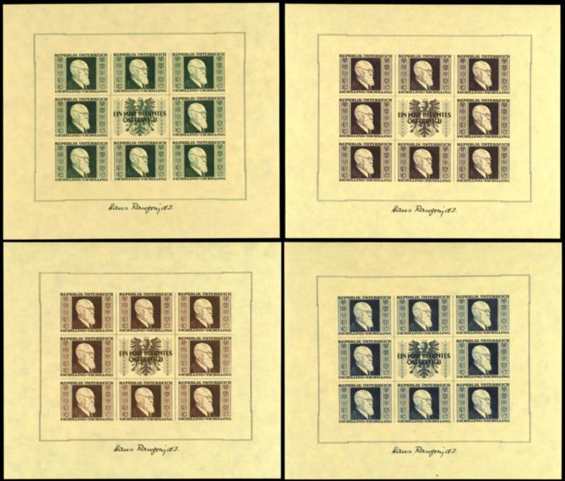 1946, 1 S. - 5 S. Renner imperforated, sheetlet set with all 4 values complete, mint never hinged, very fine, Michel 2.400.- (772/75B) 1946, 1 S. - 5 S. Renner geschnitten, Kleinbogensatz mit allen 4 Werten komplett, postfrisch, tadellose Erhaltung, Mi. 2.400.- (Image)