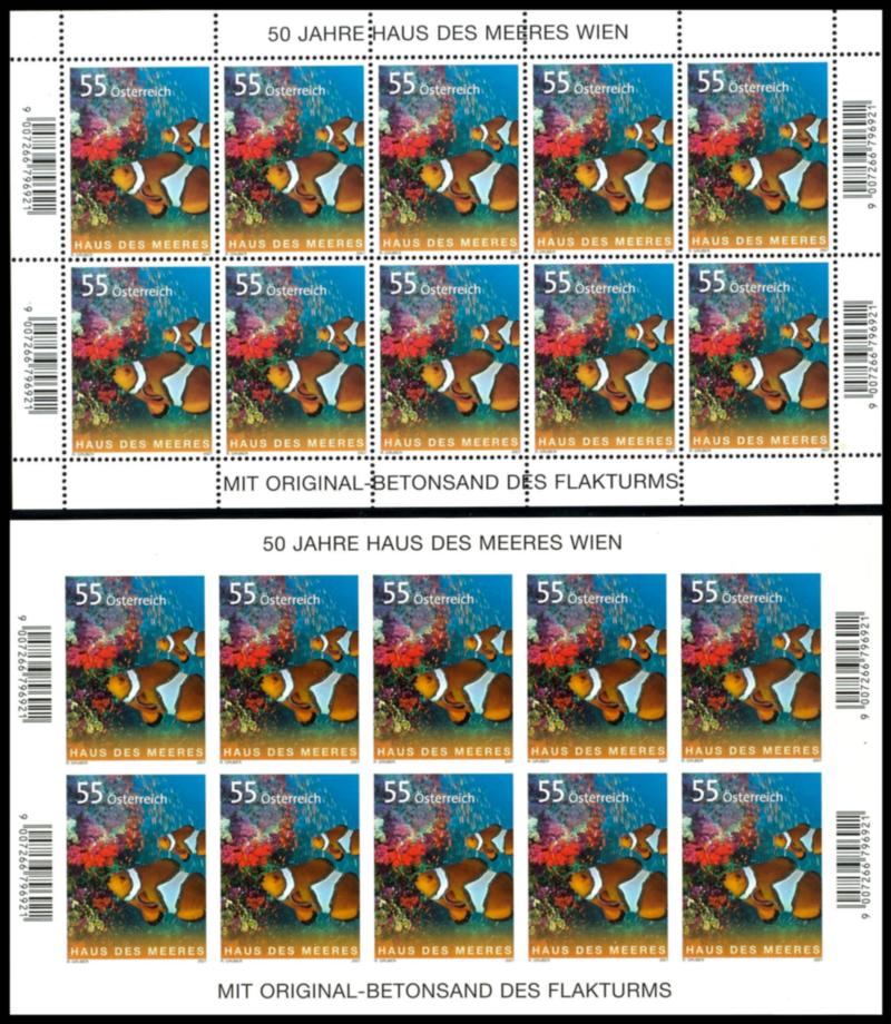2007, 55 cent house of the sea, variety "imperforated", miniature sheets to 10 values, mint never hinged, very fine, photo expertize Dr. Werner Glavanovitz VOEB "it is the first me until today known piece. " (ANK 2722 U) (2694U(10)) Certificate 2007, 55 Cent Haus des Meeres, Abart "ungezähnt", Kleinbogen zu 10 Werten, postfrisch, tadellose Erhaltung, Fotoattest Dr. Werner Glavanovitz VÖB "Es handelt sich um das erste mir bis heute bekannte Stück ..." (ANK 2722U) (Image)