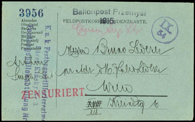 Austria 1915, Przemysl balloon mail, blue balloon card with letter cancel "K.u.k. fortress artillery regiment prince Kinsky number 3, fort balloon department" (Kohl type IIIa) to Vienna, in the text dated 21.1.15, flight stamp "balloon mail. " and post office single circle postmark "IX. 54" in small type, red one-line cancel censored, rare superb document to the postal transport in unmanned balloon from the encircled city ÖSTERREICH 1915, Przemysl Ballonpost, blaue Ballonkarte mit Briefstempel "K.u.k. Festungsartillerieregiment Fürst Kinsky Nr. 3, Festungsballonabteilung" (Kohl Typ IIIa) nach Wien, im Text datiert 21.1.15, Flugstempel "Ballonpost ..." und Postamts-K1 "IX. 54" in kleiner Type, roter L1 Zensuriert, seltener Pracht-Beleg zur Postbeförderung in unbemannten Ballons aus der eingekesselten Stadt (Image)