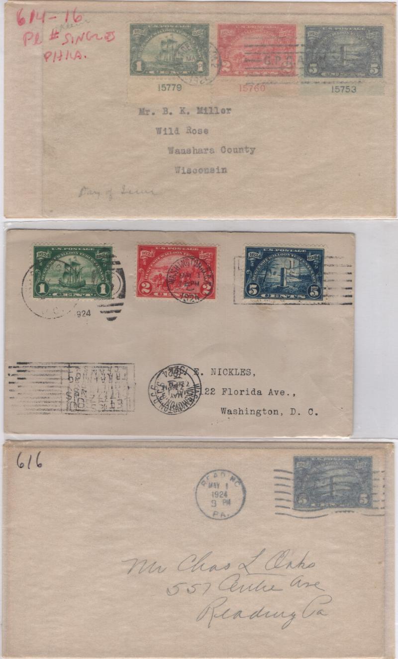 EARLY 1920s Classic dup selection over (40) incl Harding, Huguenot-Walloon, Lexington-Concord & Norse FDC w/ dup incl #614-16 (2) one cvr, 617-19 (3 ) one cvr, 620-21 (1) one cvr the balance various singles, gen F-VF (Image)