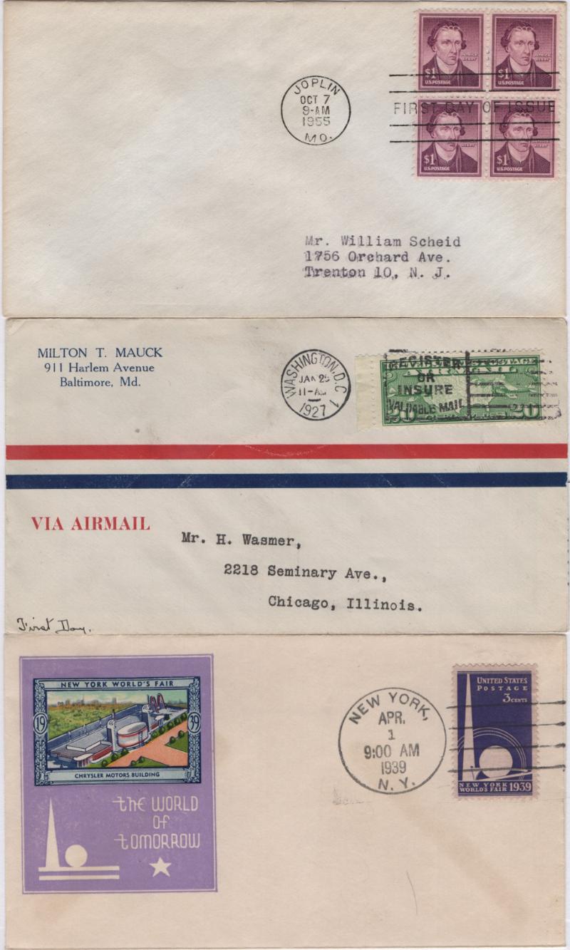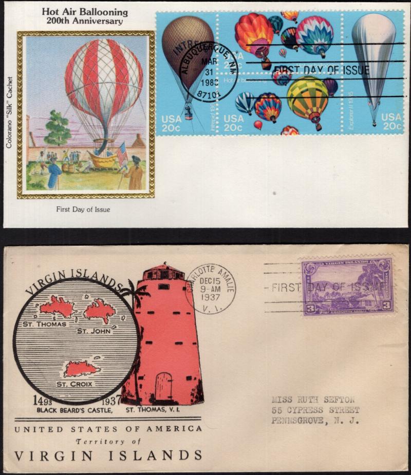 Collection FDC 1923-70, most w/ various cachets, from early handstamps or printed to later comml, both common & less so; from Harding at Marion, OH to 1970 Christmas, a few later, also good number of airmails C9 Washington CV $100 to Moon Landing; noted #623, 627, 628, 646, 644, 657 numerous towns, many other 2¢ Reds, 704-15 singles (low values postage due), many Prexies to $1, 855 no cachet, $5 Hamilton (2, one w/o cachet), C11 pair, C12, C20, C25a, C61 line pair, E17-19; also several early 1960s tagging varieties, air stationery & a few UN; both addr & UA, some flap marks or mounting evidence, gen F-VF (Image)