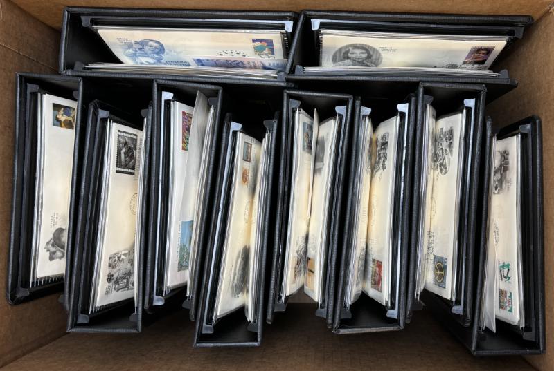 Accum abt (2100+) mostly cacheted & UA FDC incl abt (1100) loose in a box w/ many diff cachets 1950s-90s incl a few sets of 1976 State Flags & 1986 Presidents series; also in (9) albums incl abt (250) PCS cachets 1979-87, abt (80) Fleetwood cachets 1990-91, abt (100) addr AC cachets 1961-65 & abt (150) UA AC cachets 1966-71, abt (40) Olympic themed FDC, also incl abt (100+) PPC, abt (100+) early 20th Cent comml cvrs & (8) stampless cvrs; few flts to gen F-VF (Image)