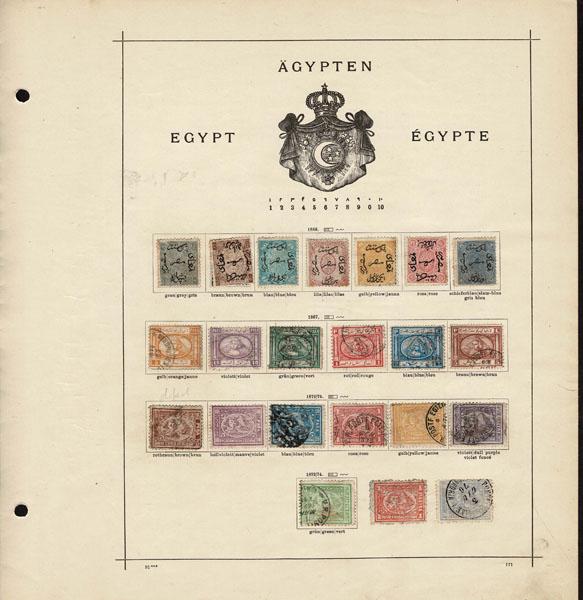 MIDDLE EAST,SOUTHERN EUROPE, WEST ASIA, LIBERIA, Collection of several hundred comprising Turkey. Egypt, Sudan, Abyssinia, Persia 1860's to 1910 mostly used on old-time Schaubek album pages, complete and short sets, some stuck down by old-time hinges (should not affect used stamps), much useful, mixed condition. Well worth the effort.