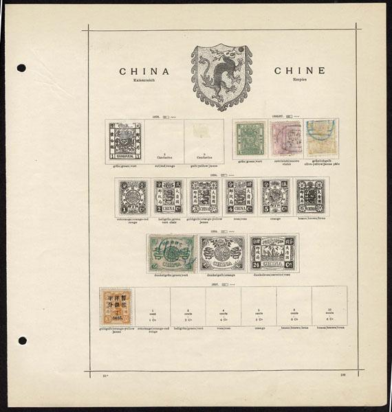 CHINA: 1885 to 1909 Collection of approximately 158 stamps on old-time Schaubek album pages, few earlies, "one cent" revenue used and a scattering of foreign offices, some stuck down by old-time hinges (should not affect used stamps), many useful.