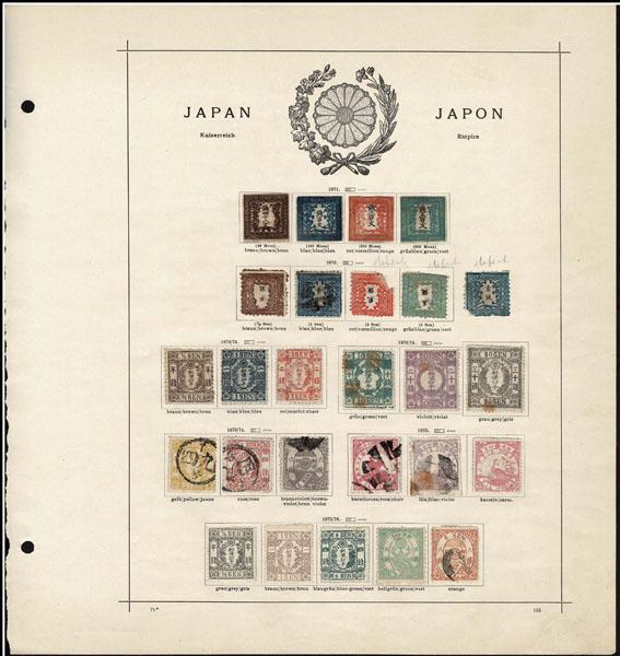 JAPAN: 1871 to 1908; Collection of about 100 mostly used stamps, on old-time Schaubek album pages. Earlies checked for genuineness, some stuck down by old time hinges (should not effect used stamps) condition is mixed but as you will see, many are useful.