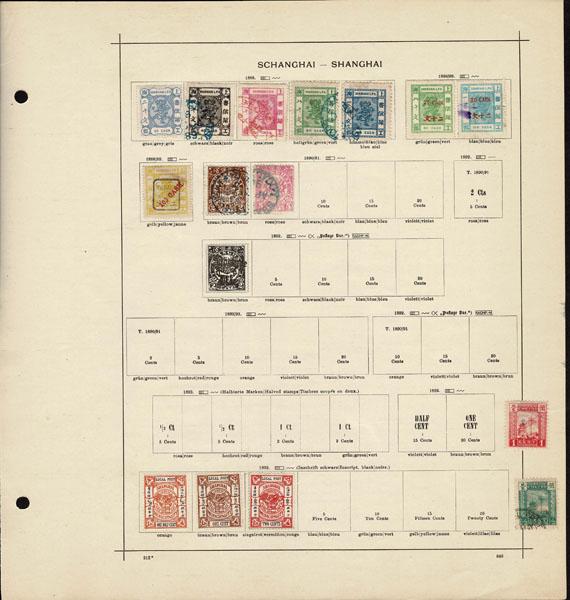 SHANGHAI: 1865 to 1897, selection of 47 stamps, 16 used, on old-time Schaubek album pages and one stock page, 1st issue well represented with 6 genuine unused stamps there may be some stuck down hinges, condition mixed but very useful.