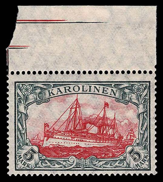 CAROLINE ISLANDS: 1901 5m slate carmine, Top Sheet margin copy, stamp never hinged, very fine. (Scott 19 $500 ) Sale and Lot Updates Scott $500 (Image)