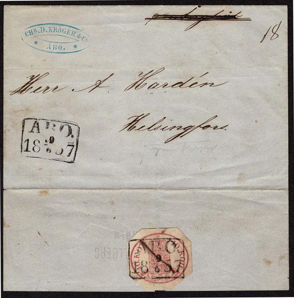 FINLAND: 1856 to 58, 10k rose octagonal cut and cancelled ARO _ 1857 hinged on reverse of of a folded lettersheet, bearing on front a duplicate of the cancel, Manuscript 18 and blue CHR Kroger & Co ARO oval handstamp. An oddity found in the 1915 collection, With Cyril Schwerson analysis.