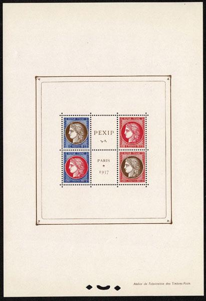 FRANCE: 1937 PEXIP Souvenir Sheet of Four. Three never hinged sheets, very fine. ( 329 $2,100 ) Sale and Lot Updates $2,100 (Image)
