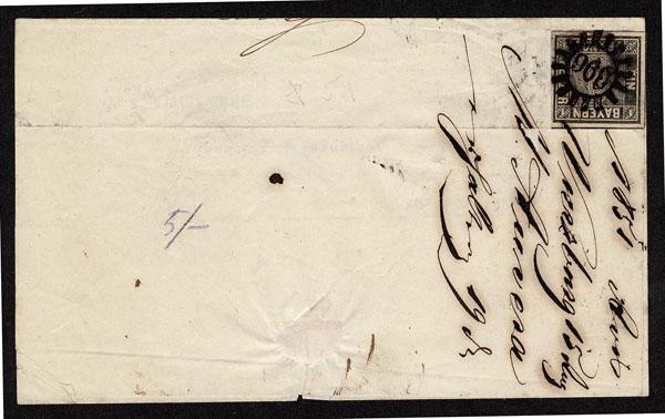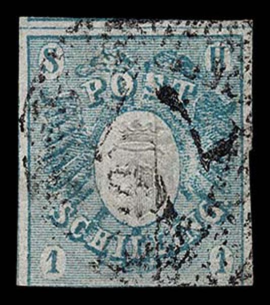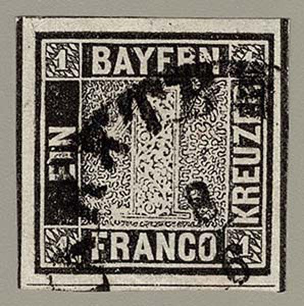 GERMAN STATES; BAVARIA: 1849 1kr black Plate 1 , part town cancel, guidelines three sides, ever so faint corner crease in BL margin, still very fine. (Scott 1 $2,250 ) Sale and Lot Updates Scott $2,250 (Image)