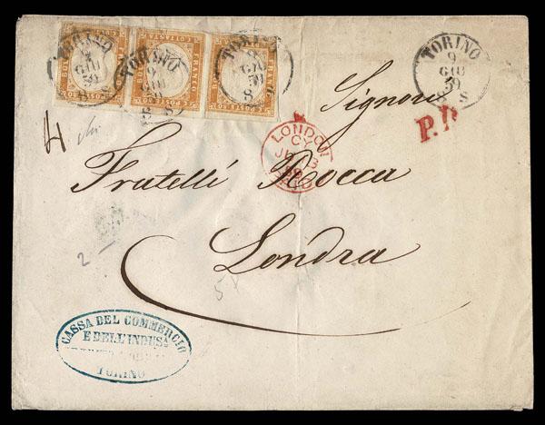 ITALIAN STATES: SARDINIA; 1859 80c yellow ocher horizontal STRIP OF THREE on cover to London, cancelled "TORINO 9 GIU 59 8S" with red "PD" on side and red arrival cancel in London June 13. Avi Cert (2025) Sassone €40,000 Sale and Lot Updates Suggested Bid $1,000-1,250 (Image)