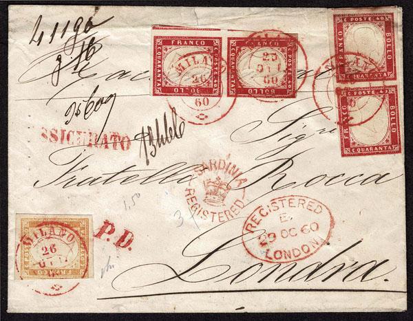 ITALIAN STATES: SARDINIA; 80c yellow ocher and two vertical pairs of 40c carmine on Registered cover to London, tied by red MILANO 26 OTT 60 cancels arrival cancels. Avi Cert (2025) Sassone €18,750 Sale and Lot Updates Suggested Bid $600-800 (Image)