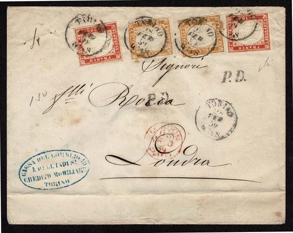 ITALIAN STATES: SARDINIA; 1859 80c (2), small faults, 40c (2),orange ocher and orange vermillion on cover to London, tied by "TORINO 23 FEB 4 1/2 S" c.d.s. with "P.D." with red arrival cancel and blue company marking on reverse . Avi Cert.( 2025) Sassone €16,500 Sale and Lot Updates Suggested Bid $500-750 (Image)