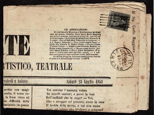 ITALIAN STATES: TUSCANY;1852 1g black on grayish blue paper, margins three sides, just in at top, tied on the front page of the complete four page newspaper, L 'ARTE GIORNALELETTERARIO, ARTISTICO, TEATRALE bearing FIRENZE 23 LUG 1853 origin and 25 LUG 1853 receiver postmarks, An appropriate paper for a work of art. Just lovely . Avi Cert.( 2025) (Sannone 1 €27,400) Scott 1 $12,000 ) Sale and Lot Updates Scott $12,000 (Image)