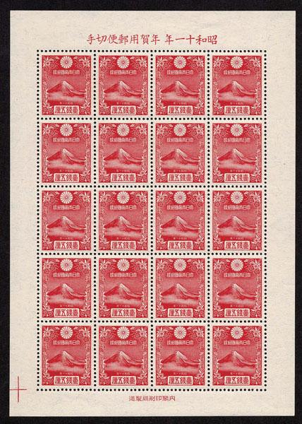 JAPAN 1935 1 1/2s rose carmine, New Year's Greetings, miniature sheet of 20, n.h., extremely fine. ( 222a $700 ) Sale and Lot Updates $700 (Image)