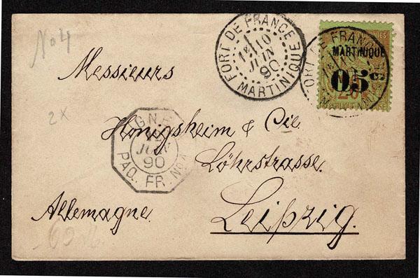 MARTINIQUE used to GERMANY: 1888 05c on 20c red on green, neatly tied by FORT DE FRANCE MARTINIQUE 10 JUN 90 c.d.s. on petite envelope bearing PA Q FR NO A 12 JUIN octagon, to Lupzig. (Scott 13 $375 ) Sale and Lot Updates Scott $375 (Image)
