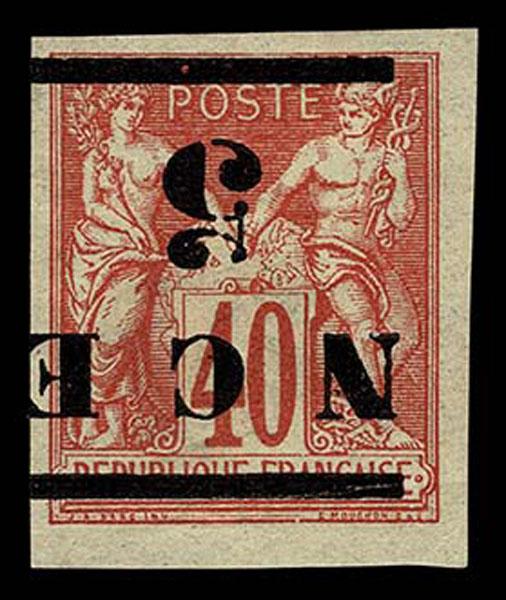 NEW CALEDONIA 1882 5c on 48c red INVERTED SURCHARGE, part o.g. hinge remnants, good to large margins all around, very fine. (Scott 2a $1,600 ) Sale and Lot Updates Scott $1,600 (Image)