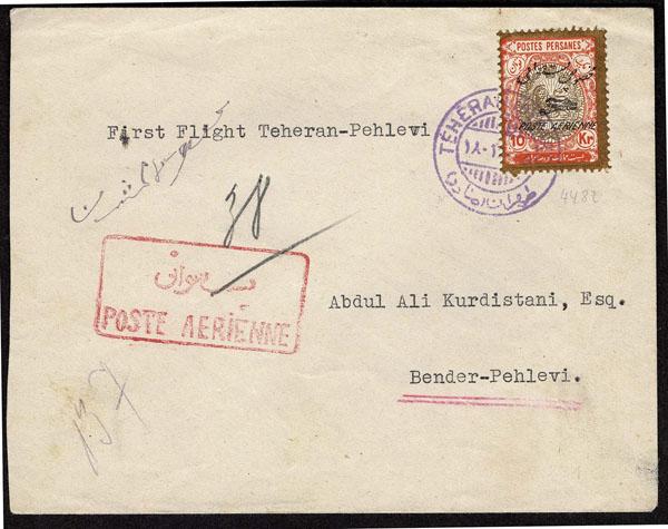 PERSIA - IRAN: 1927 10k gold orange & blister brown, tied by purple TEHERAN double circle c.d.s.. First Flight Teheran - Pahlevi, envelope bearing red boxed POST aerienne postmark with receiver on reverse.