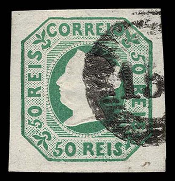 PORTUGAL: 1853 50r deep yellow green, numeral in grid cancel, extremely fine. very rare Ex George SayerFoundation Cert. (1983) & Serrane handstamp. (Scott 3 $875 ) Sale and Lot Updates Scott $875 (Image)