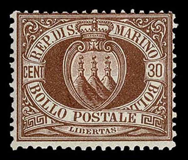 SAN MARINO : 1877 -1899 30c brown, bright fresh color, typical centering, o.g. hinge remanent, fine for this issue. (Scott 15 $925 ) Sale and Lot Updates Scott $925 (Image)