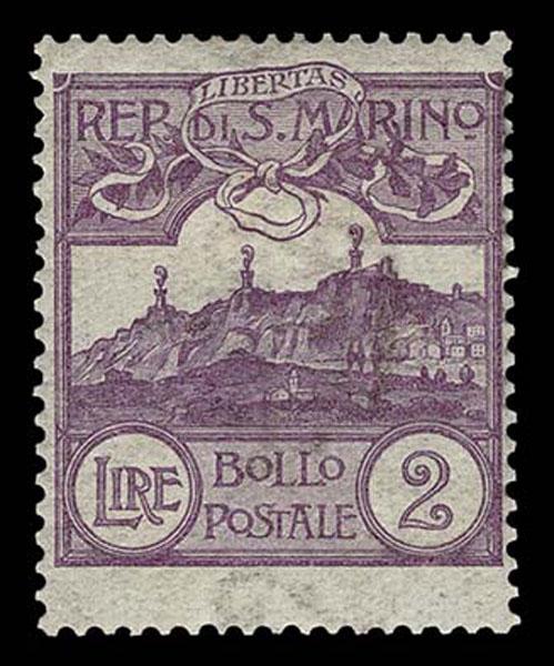SAN MARINO: 1903-25, 2 L violet, Cypher and Castles, fresh color and paper, o.g. hinge remnant, fine. (Scott 72 $1,000 ) Sale and Lot Updates Scott $1,000 (Image)