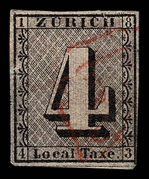 Cantonals.SWITZERLAND: ZURICH; 1843 4R black, red vertical lines, faint red cancel, margins almost all around, few faults, still fine appearing :A chance to fill that very elusive and expensive place in your album. (Scott 1L1 $18,500 ) Sale and Lot Updates Scott $18,500 (Image)