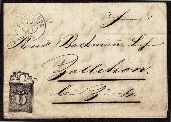 SWITZERLAND: ZURICH; 1846 6R black, horizontal lines, margins all around, showing dividing line at right, tied by rare black rosette cancel on folded partially printed invoice bearing WINTERTHUR 13/11/48 c.d.s. , on reverse, partial red ZURICH transit . (Scott 1L4 $4,200 ) Sale and Lot Updates Scott $4,200 (Image)