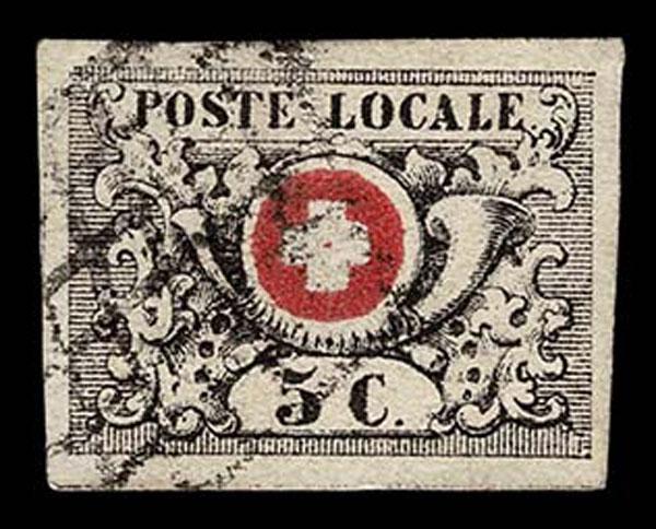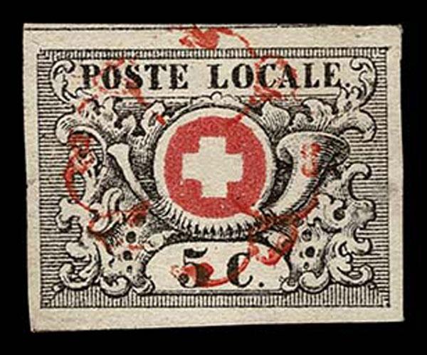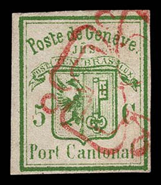 SWITZERLAND: Geneva (GENF); 1850 5 Centimes, black and red, red cancel, margins all around, dividing line at top, "perfect condition" "except tiny crease" which we can not see, very fine. Neumann Cert. (2025). ( 2L6 $1,950 ) Sale and Lot Updates $1,950 (Image)