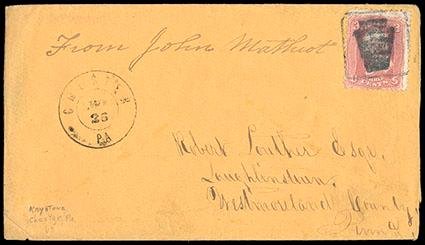 Keystone of Chester, Pa. Bold strike in framed square ties 1861 3¢ rose (trivial corner crease) on cover with Chester, Pa. double circle postmark at left, Very Fine, unlisted in Skinner-Eno,ex-E. Haub. Estimate; $200 - 300. US$200-300 (Image)