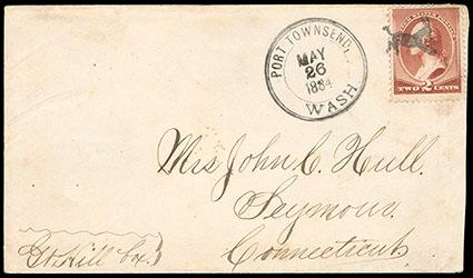 Kicking Mule of Port Townsend, Wash. Gorgeous strike ties 2¢ Bank Note on cover to Connecticut with clear strike of "Port Townsend, Wash. May 26, 1884" double circle postmark alongside, slightly reduced at right, Very Fine and attractive,ex-E. Haub. Estimate; $300 - 400. US$300-400 (Image)