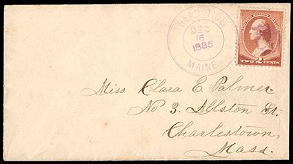 Liberty Head of Head Tide, Maine. Purple pictorial handstamp duplexed with "Head Tide, Maine, Dec 16, 1885" cds tying 1883, 2¢ red brown (210) on cover to Charlestown, Mass., receiving backstamp, Very Fine, with 2024 P.F. certificate. Estimate; $300 - 400. US$300-400 (Image)