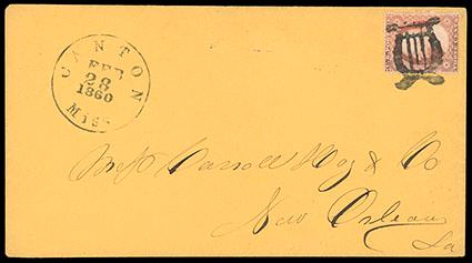 Lyre (Large) of Canton, Miss. Bold complete strike tying 1857, 3¢ dull red (26) on fresh cover to New Orleans, La., matching "Canton, Miss., Feb 28, 1860" cds, Very Fine, with 2025 P.F. certificate. Skinner-Eno No. PO-Lh 1; Estimate $1,500 - 2,000. US$1,500-2,000 (Image)