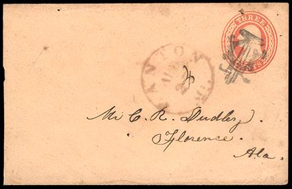 Floral Design of Harrisburgh, Pa. Unusual small square floral design (unlisted in S-E, similar to S-E PT-E 19) ties 1861 3¢ rose on cover to Alabama with Harrisburgh, Pa, cds alongside, right side of cover repaired not affecting design, Fine,ex-E. Haub. Estimate; $100. US$0 (Image)