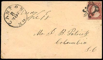 Lyre (Small) of Canton, Miss. Bold virtually complete strike tying 1857, brownish rose, type I (25) on cover to Columbia, S.C., matching "Canton, Mi., Nov 8" cds; light cover wear and minor stamp flaws, otherwise Very Fine, featured in Milgram's Fancy Postmarks of Canton, Miss. article in the Chronicle (Nov. 2015). Skinner-Eno No. PO-Lh 3; Estimate $300 - 400.