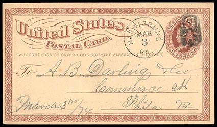 Man in Coffin of Harrisburg, Pa. Sharp complete strike with "Harrisburg, Pa., Mar 3" cds alongside, canceling on fresh 1¢ Liberty postal card (UX3) to Philadelphia, 1873 dateline at lower left, Extremely Fine, a choice illustrated fancy and card. Cole No. JO-179; Estimate $200 - 300. US$200-300 (Image)