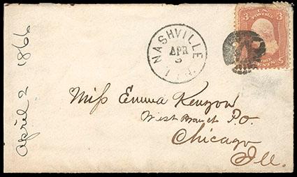 Mask of Nashville, Ten. (S-E PH-M 7) nice strike ties 1861 3¢ rose (defective) on small cover to Chicago, postmarked Nashville, Ten. cds, part of flap torn away, Very Fine and attractive, with 2015 P.F. certificate. Estimate; $150 - 200. US$150-200 (Image)