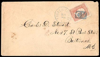 Negative "CV" of Charlottesville, N.C. Nice strike of blue negative (S-E LC-C 4) ties 1861 3¢ rose (small faults) on cover, additionally tied by matching Charlottesville cds, Very Fine and attractive, with 2009 P.F. certificate. Estimate; $200 - 300. US$200-300 (Image)