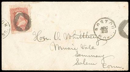 Fancy Cancels of Massachusetts. On ten covers; with Oak Tree in Circle of Chelsea (unlisted), blue Running Stag in Circle of Shelburne Falls (PA-Dr 1), Square & Compass in Circle of Mittineague (FR-M4c 3), "Paid" in Grid of Beverly and Orange in blue, "Paid" in Circle of Andover in blue, Straight Line "Paid" of Lincoln, Circle of Wedges of Leicester, and "3" of Leominster (NS-C 7) on #24 on circular; mostly complete strikes, some small cover flaws, generally F.-V.F. or better. Estimate; $400 - 600.