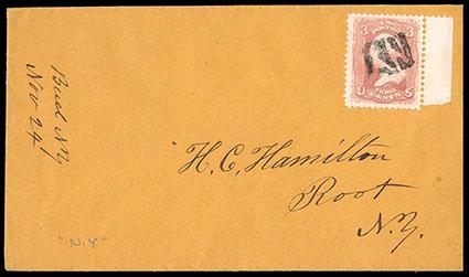 Negative "NY" of Buel, N.Y. Nice strike (S-E LC-N 5) on 1861 3¢ rose (large margins with sheet margin) on cover with "Buel, N.Y. Nov. 24" manuscript postmark, slightly reduced at right, Extremely Fine and choice,ex-Eno, with 2016 P.F. certificate. Estimate; $300 - 400. US$300-400 (Image)