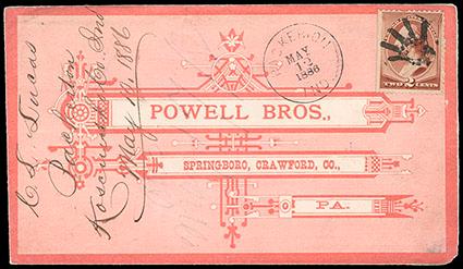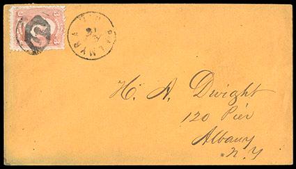 "Globe" of Zanesville, Ohio. Complete strike (S-E PO-GI 1) on well centered 1861 3¢ rose, Extremely Fine,ex-Saadi, with 1981 P.F. certificate. Estimate; $100 - 150. US$100-150 (Image)
