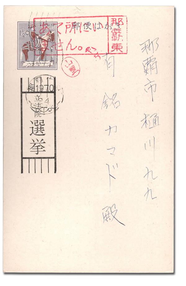 Ryukyus, Election Postal Card, 1970, 1½¢ 21st District Special Election (Scott UZE28), a postally used card for candidate Miyari, Very Fine. Scott $130. Estimate $50 - 75. Scott $130 Suggested Bid $50-75 (Image)