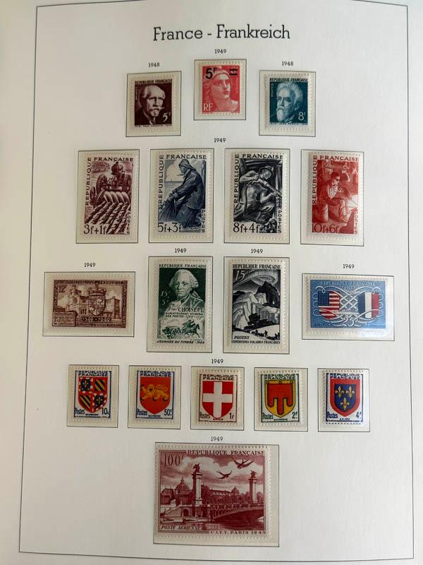 France, 1945-82, a beautiful modern mint collection, nearly complete for the period, apparently missing only 10 stamps for completion, all nicely housed in a Lighthouse hingeless album, including regular issues, commemoratives, art stamps, semi-postals, airmail, postage dues and officials. A perfect way to add to your French collection, o.g., much never hinged / some very lightly hinged, mostly Very Fine. Shipping weight 7 lbs / 3.2 kilos. Scott $2,400. Estimate $300 - 400. View a PDF of images for this lot Scott $2,400 Suggested Bid $300-400 (Image)